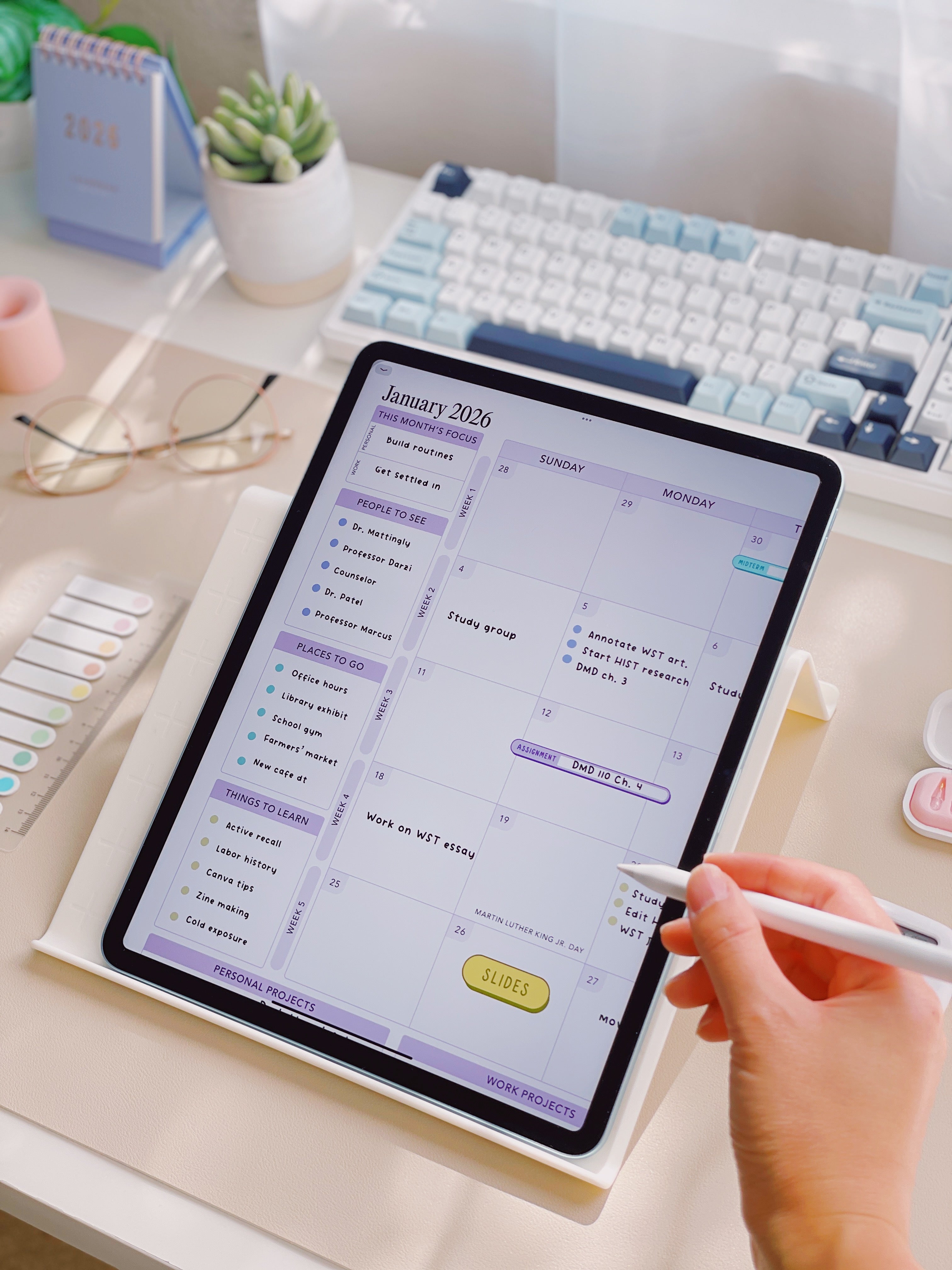 Passion Planner Digital is a hyperlinked PDF designed to work in note-taking apps like Goodnotes, Notability, or Xodo. You can write, highlight, add stickers, and customize pages just like a paper planner—only on your tablet or iPad. Learn more about how it works.