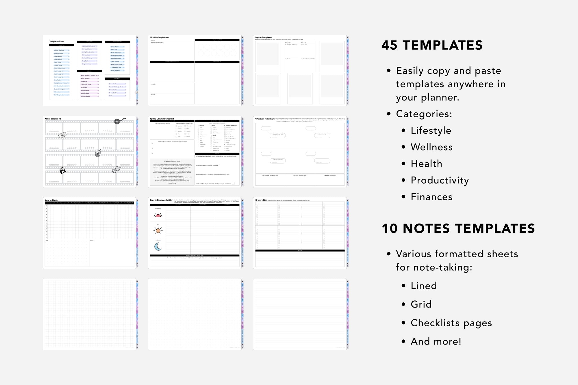 - Notes Templates (10): Various formatted sheets for note-taking, including lined, grid, checklists pages and more. Notepad templates can be copied and pasted anywhere in your planner to help you stay focused and inspired. Includes the following note templates: Blank, Graph, Dot Grid, Lined, Lined Column, Cornell Notes, Column, Checklist, Kanban Board, Eisenhower Matrix